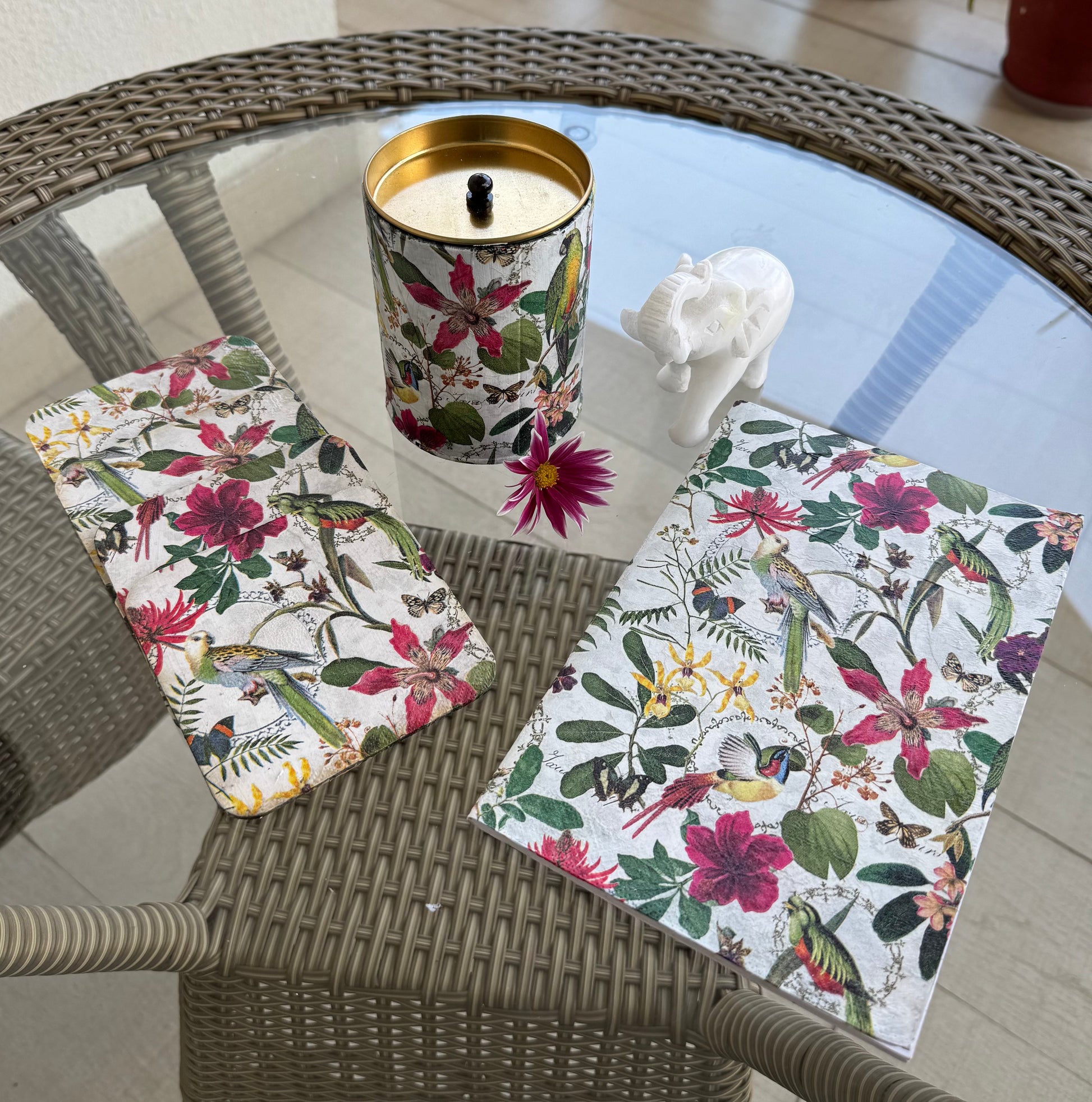 A set of a cylindrical box, 4 coasters and 1 diary of the same red flower and bird print.